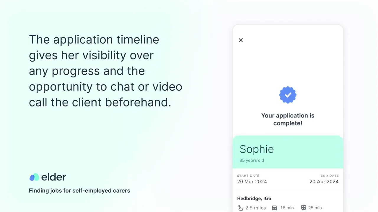 Elder is a marketplace – connecting self-employed carers to families seeking care. We have three core functions – (1) help self-employed carers and families to find each other, (2) match with each other and (3) manage their ongoing relationship directly. We enable this through our unique technology, for carers this is the ElderHub, which is an all-in-one tool to give you complete choice and control over how and when you work.